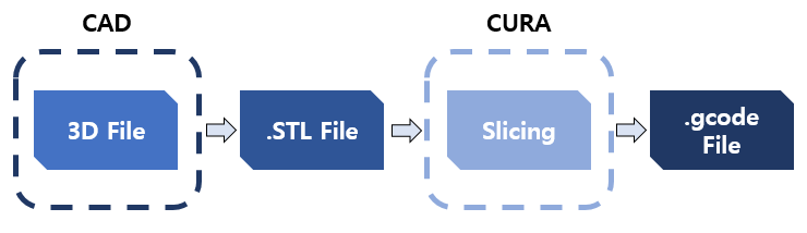 3D 프린터는 코드의 내용에 따라 헤드 또는 베드를 움직이며 출력을 진행하는데, 해당 파일은 아래와 같은 과정으로 변환이 가능하다.