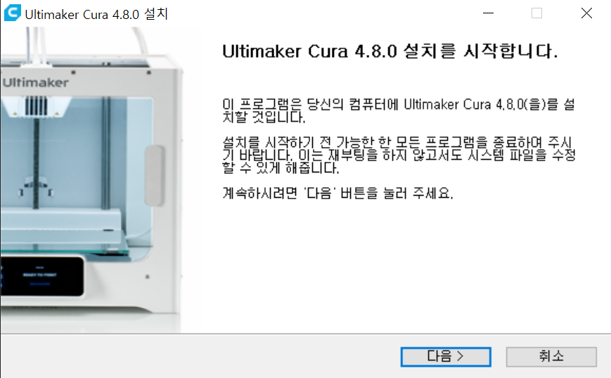 Cura 프로그램은 설치 후 초기 세팅 과정이 필요하기 때문에