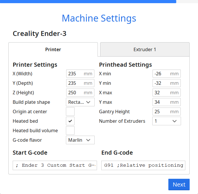 이 부분이 각 3D 프린터의 사양에 맞게 각종 수치가 세팅되는 화면이다.