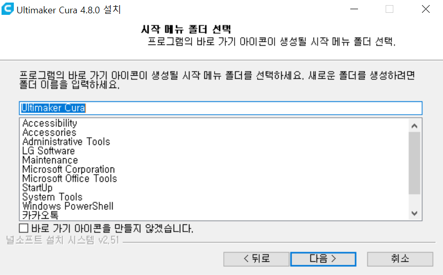바로가기 아이콘을 만들 시작 메뉴 폴더 위치 선택 과정인데, 그대로 '다음'을 누르면 된다.