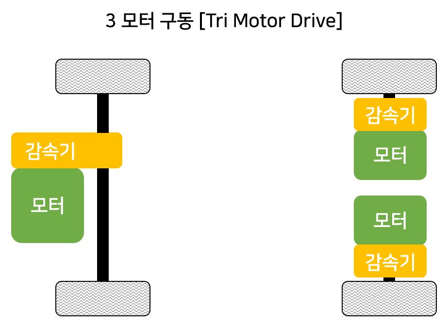 ※ 위 Tri-Motor 구성을 보게 되면, 전륜에도 후륜처럼 각 바퀴에 모터를 하나씩 장착하여 시스템을 구성하면 더 높은 출력을 얻을 수 있을 것 같은 생각이 든다. 그런데 그러한 시스템은 현재 양산되고 있지 않다. 이는 필자의 개인적인 의견이지만, 아무래도 전륜에는 차량의 조향에 필요한 장치들이 들어가야 하기 때문에 각 바퀴에 개별 모터를 장착하기에는 공간적인 여유가 나오지 않기 때문일 것 같다. 다만 이와 같은 개념을 그나마 유사하게 구현할 수 있는 시스템은 '인휠 모터'를 사용한 시스템일 것이다. '인휠 모터'는 바퀴 자체가 모터로, 바퀴 자체가 동력을 가질 수 있는 장치이다. 아직까지 인휠 모터를 장착하여 대량 양산된 차량은 존재하지 않는다.