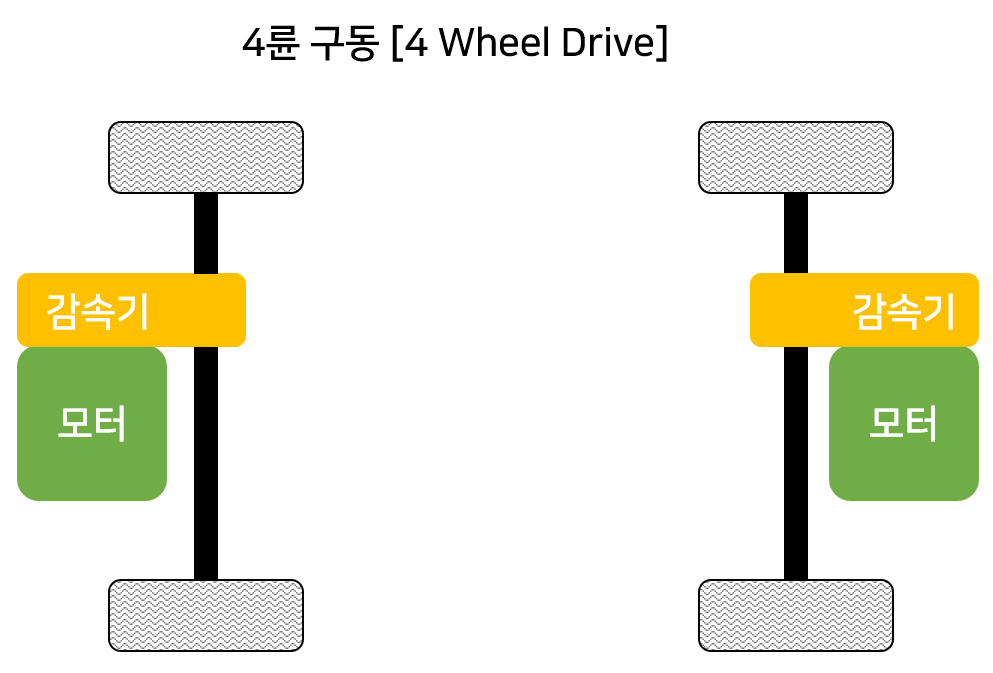 전,후륜 모두 모터를 위치하여 4륜 구동을 구현할 수 있는 구성이다.