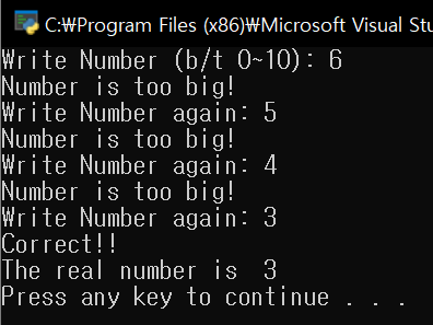 while 문을 사용하여 입력받은 숫자를 비교하여 정답을 맞힐 때까지 반복적으로 숫자를 입력받도록 구현하였다.