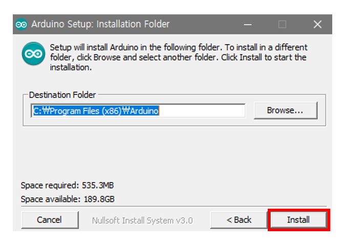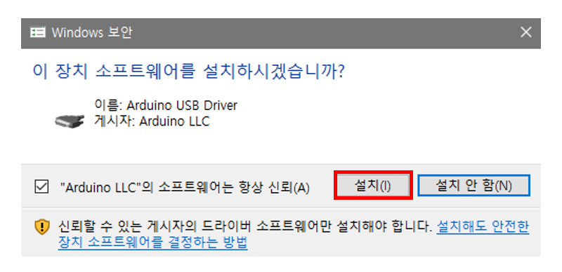 설치 중간에 USB 드라이버 설치에 관한 알림 창이 뜨는데, 아두이노 보드를 컴퓨터와 연결할 때 필요한 드라이버이기 때문에 설치 버튼을 눌러주면 된다.