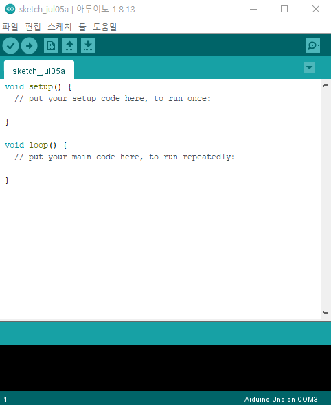 이 창을 보게 된다면 아두이노 IDE 프로그램이 모두 정상적으로 설치된 것이다.